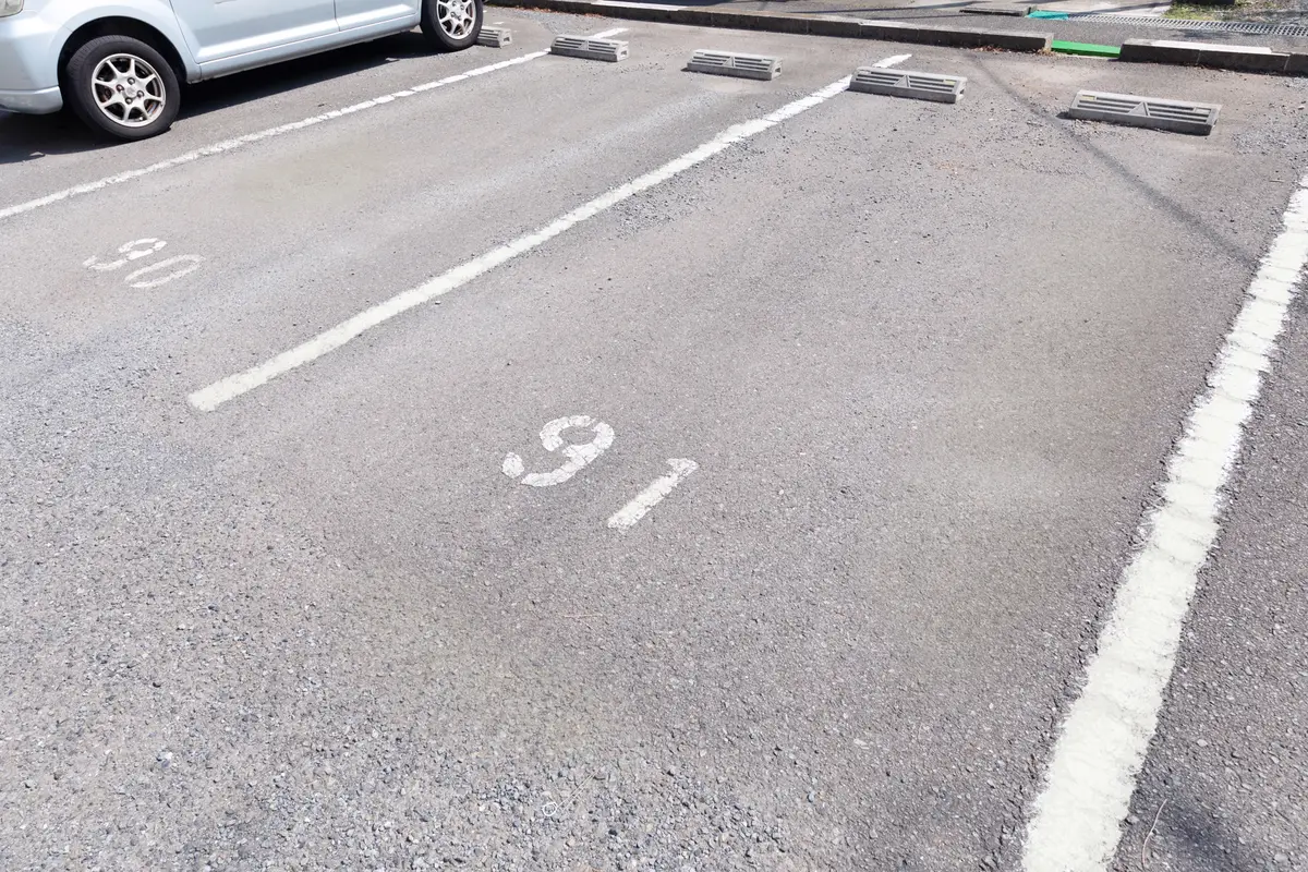 白線や区画番号がしっかり引かれ、コンクリートの車止めも設置された、非常に綺麗なアスファルト舗装の駐車場です。