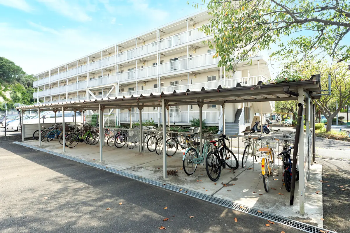 敷地の緑に囲まれた気持ちの良い場所にあり、自転車を停めるのが楽しくなりそうですね。