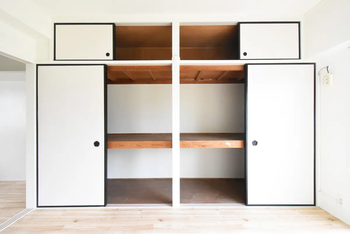 6帖側にある押入れがメインの収納です。奥行きがあるので収納力は抜群。天袋までしっかり活用しましょう。