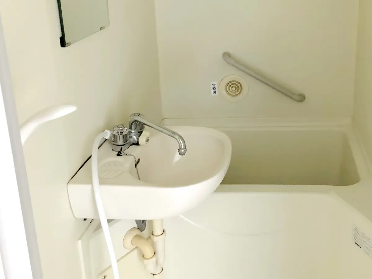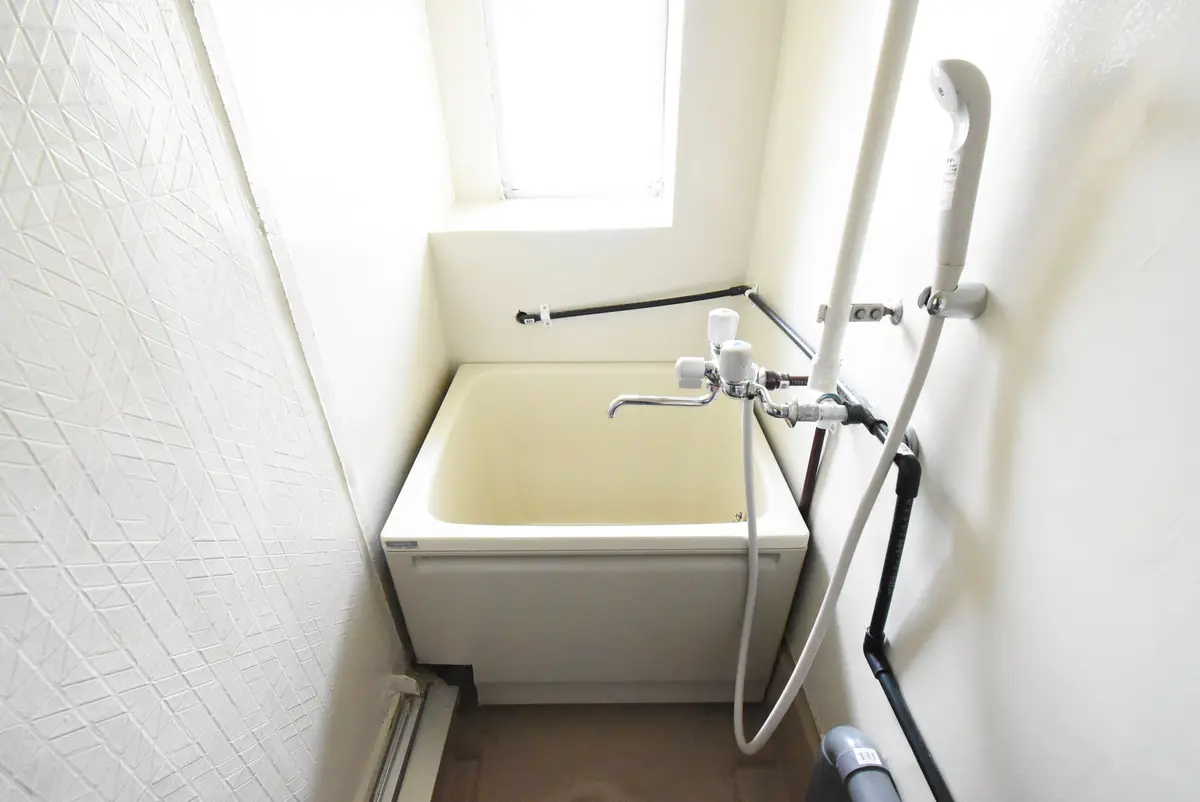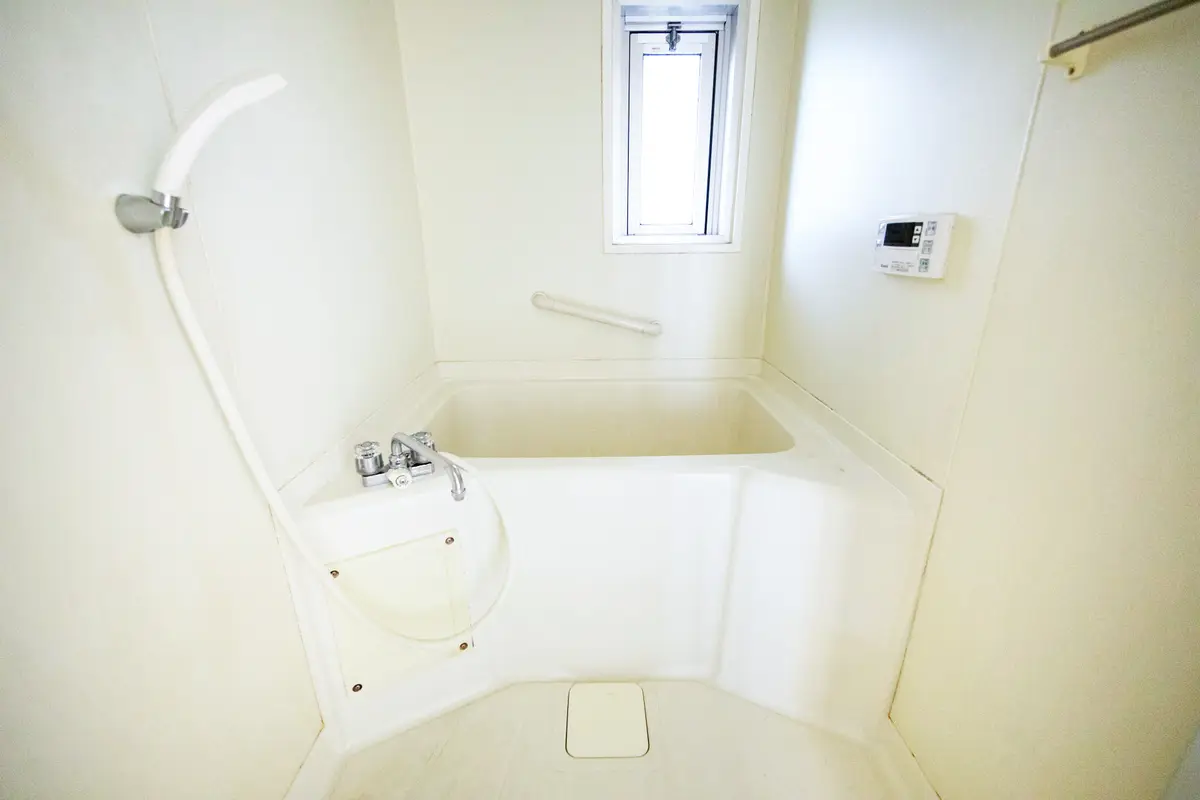 壁に追い焚き機能付きの給湯リモコンが設置され、浴槽や床も新しくなっている可能性が高いフルリフォームに近い浴室です。見た目もスッキリしており、一般的な賃貸物件と遜色ないバスタイムが送れます。