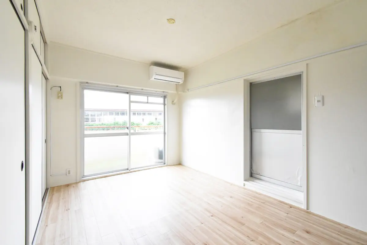 玄関を開けてすぐキッチンです。調理スペースは正直狭いので、シンクに渡せる水切りラックや、折りたたみ式の作業台をDIYすると格段に使いやすくなります。 - 2つの洋室