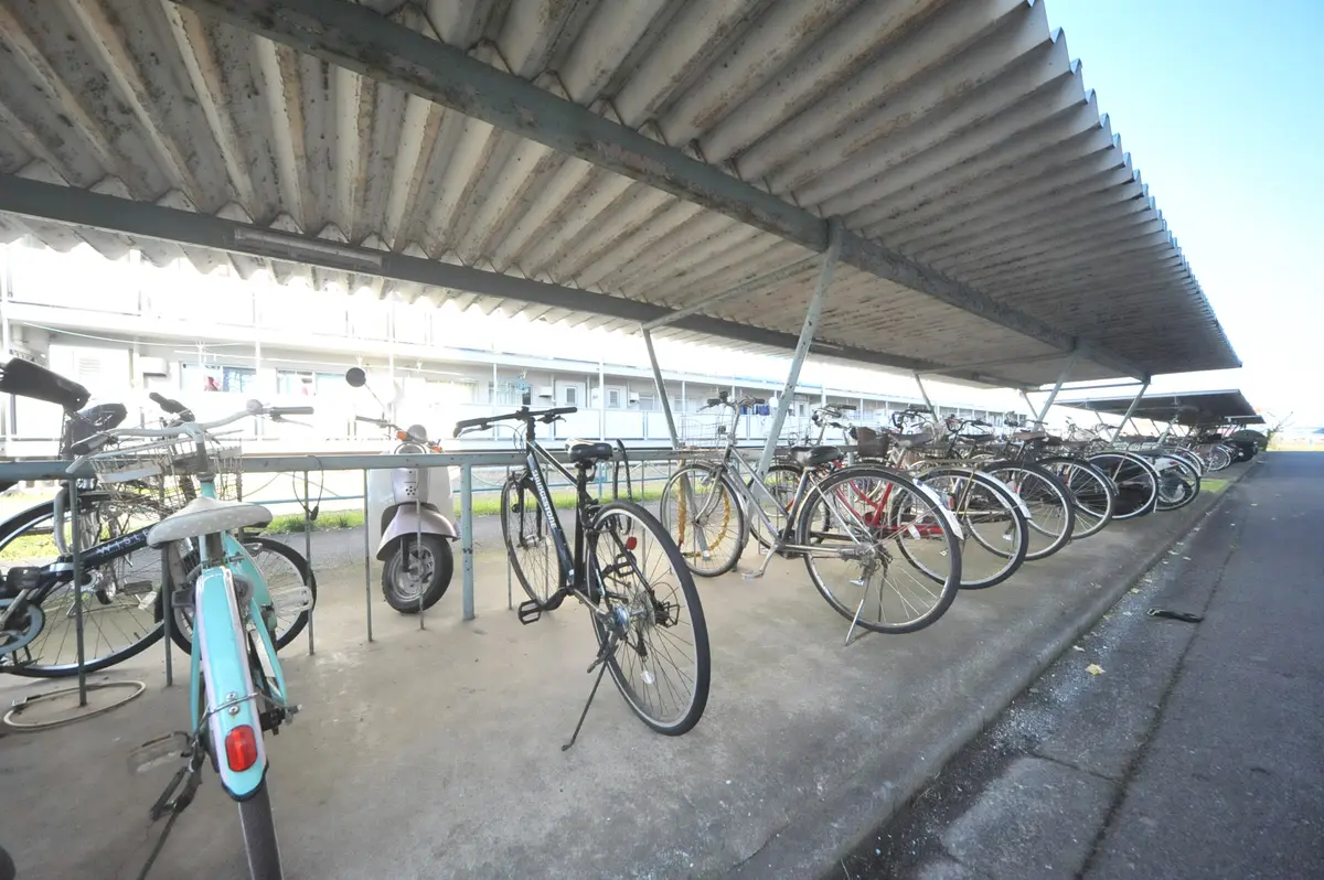 車がない代わりに、この物件の「足」となる自転車を守る、広々とした屋根付き駐輪場です。