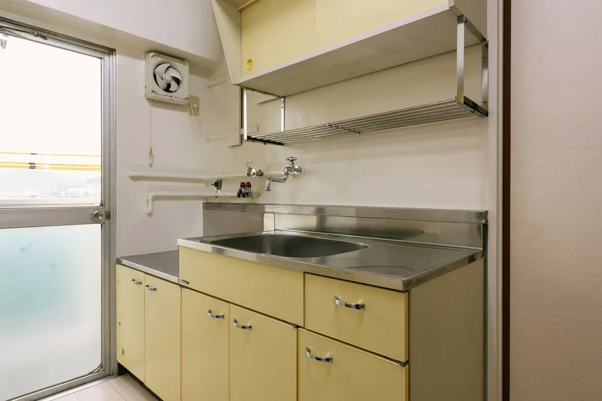 キッチンはステンレス製で、上下に収納がしっかり備わっています。
